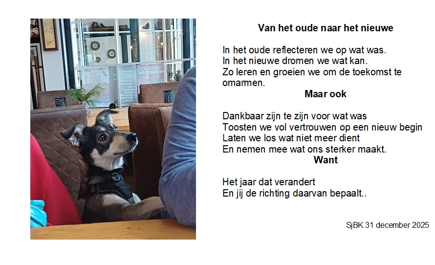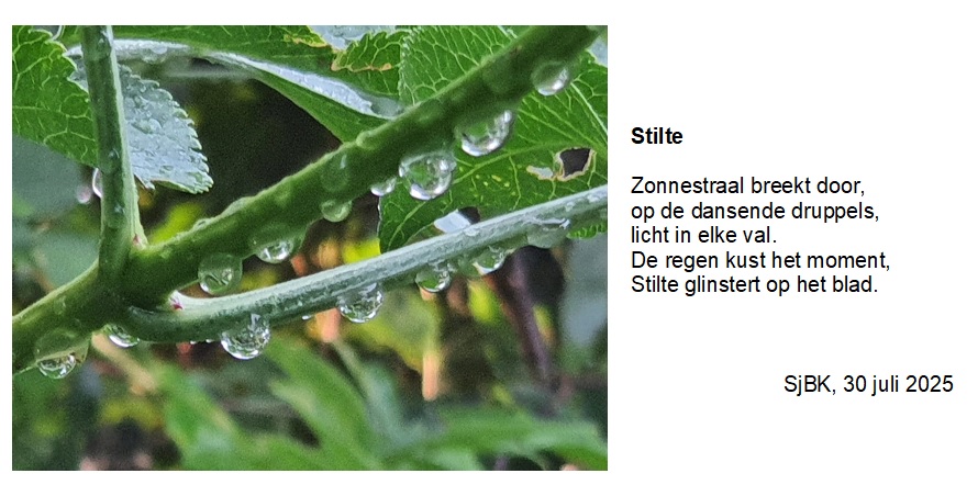 Het waait en de zon schijnt. De bladeren vallen, opgejut chaotisch in pardon Als veertjes aan het ballen. Wolken verschijnen, druppels vallen, en kleine stukjes blauwen, vechtend als vazallen, tegen ’t witte snauwen. Krommen de takken in gelid, bladeren in centrum formant Bomen in een grid, raast de wind door het land. SjBK, 23 oktober 2025 |